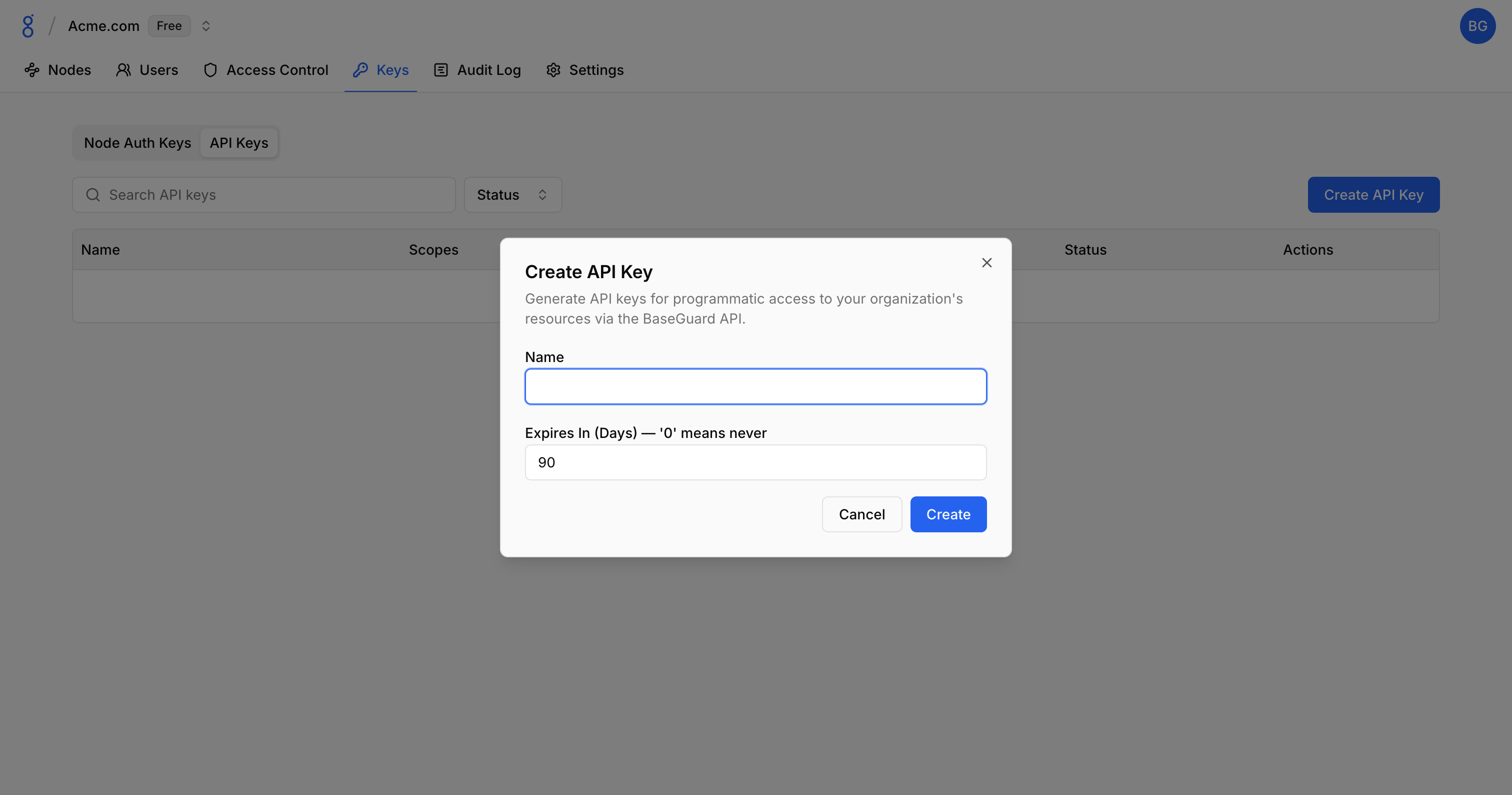 API keys authenticate requests to the Baseguard REST API. Use them for infrastructure automation, custom integrations, and programmatic management of your network.