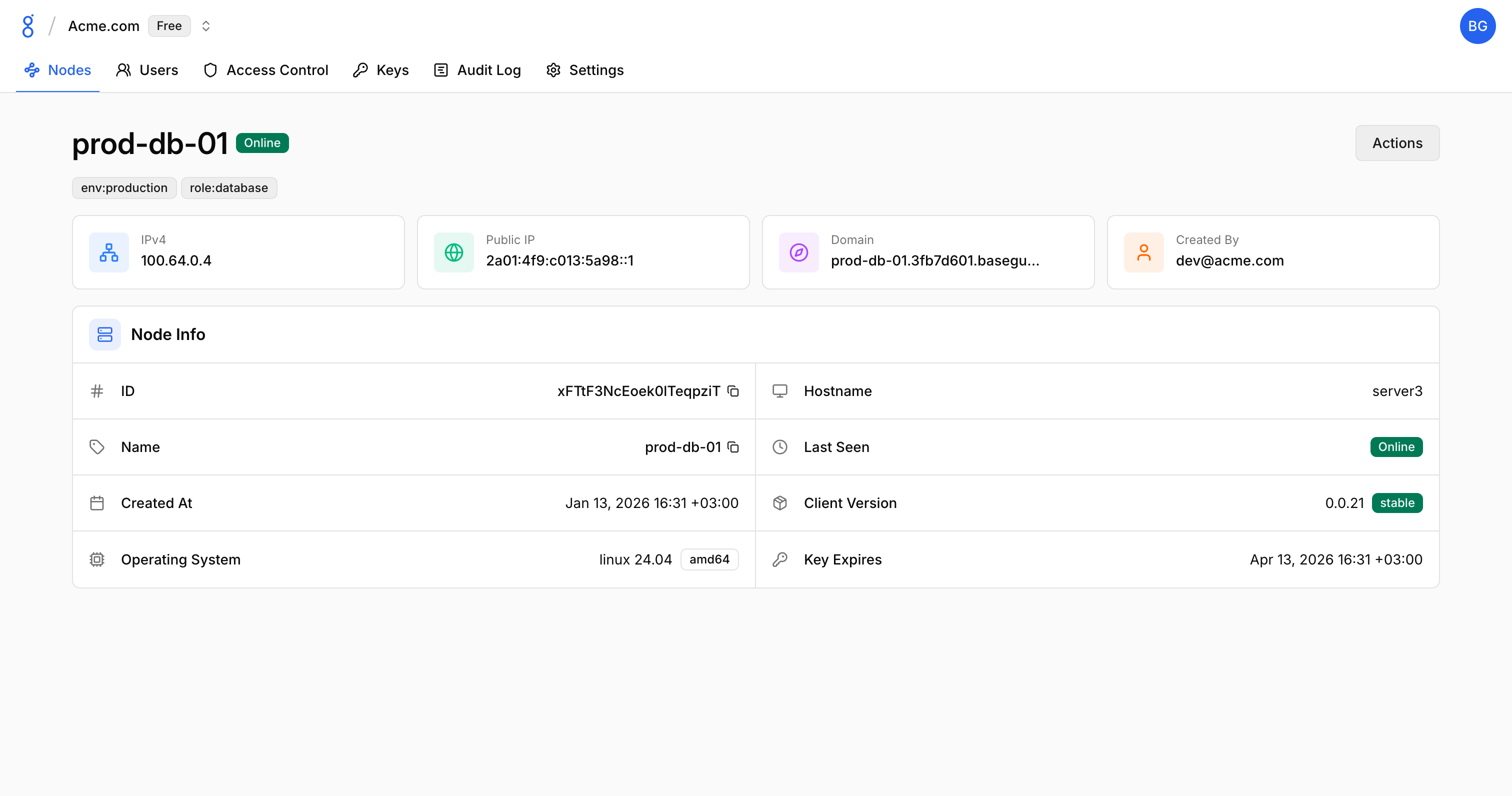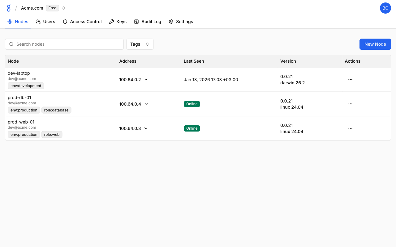 Nodes are devices connected to your Baseguard mesh network. Each node receives an overlay IP address and can communicate with other nodes based on ACL rules.