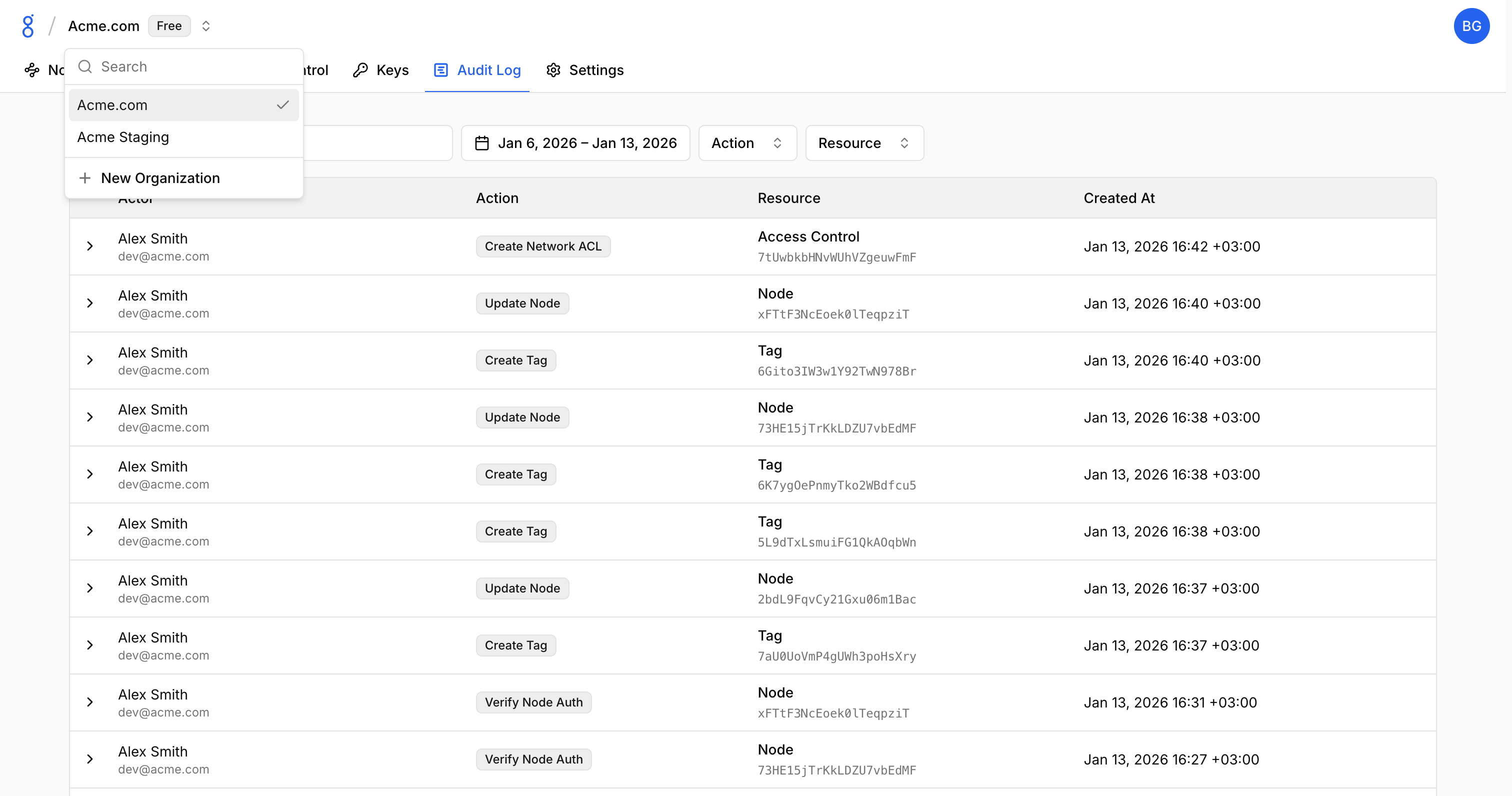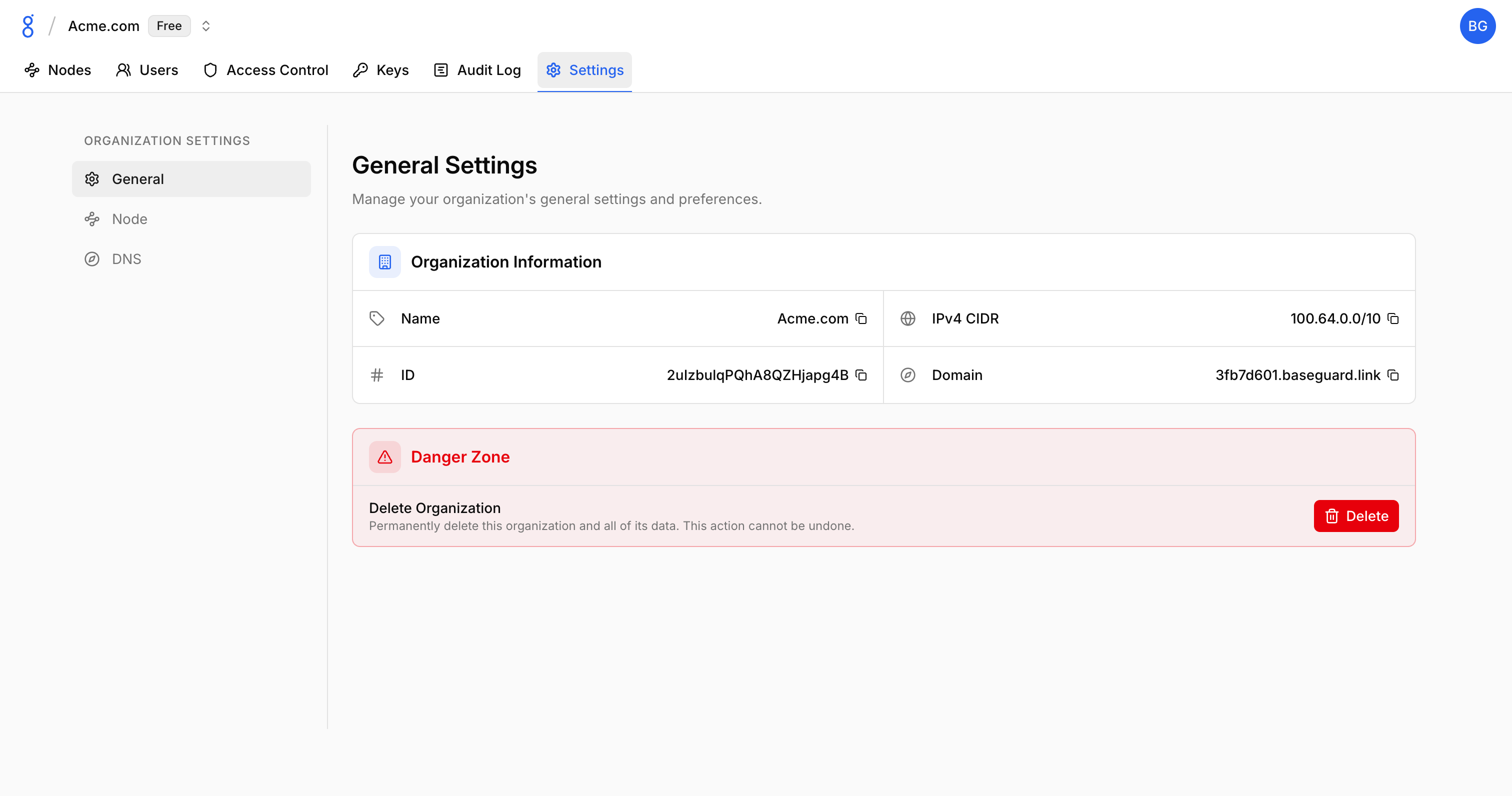 Organizations are the top-level container for your Baseguard network. Each organization has its own overlay network, access control rules, and user membership.
